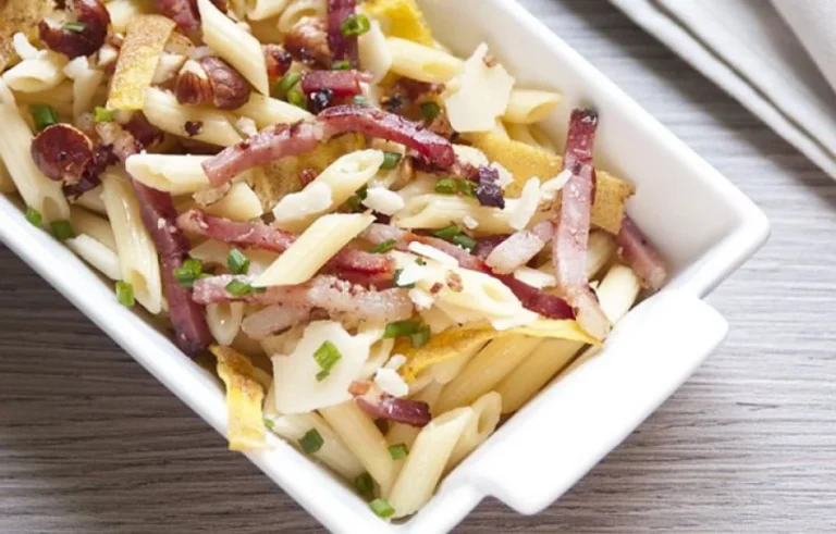 les ingrédients: 100 grammes de penne rigate, 15 grammes de noisettes, 10 grammes de parmigiano reggiano, 0,5 grammes d’œufs, 0,5 grammes de ciboulette, 1 cuillère à café d’huile d’olive, un peu de sel et de poivre.